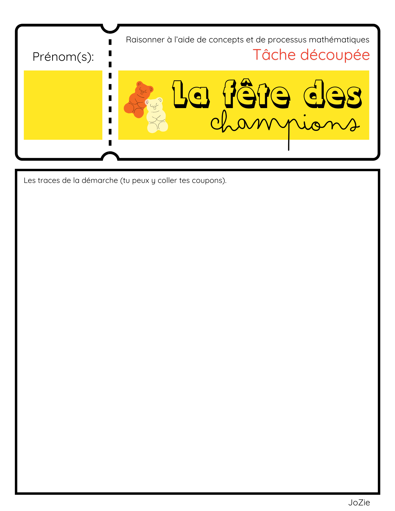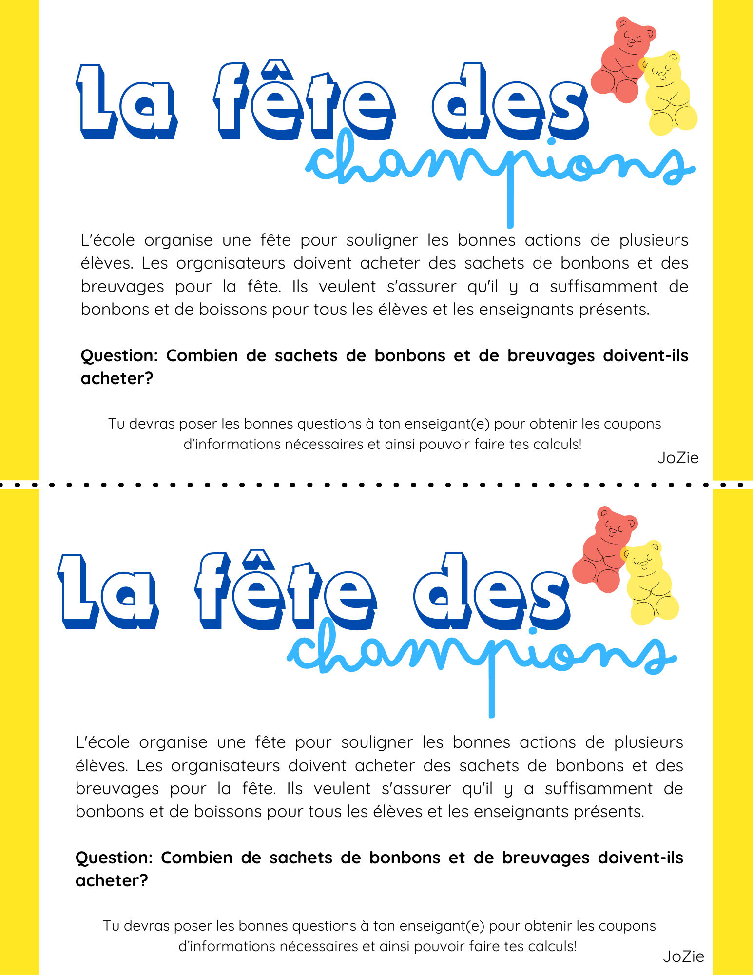 Une tâche découpée est un problème mathématique dans lequel les élèves doivent poser des questions pour obtenir les informations nécessaires à la résolution du problème (comme des données, quantités, nombres, etc.). Après avoir lu la mise en situation, qui ne contient aucun nombre explicite, ils doivent aller chercher les informations en posant les bonnes questions et en utilisant un vocabulaire mathématique précis.