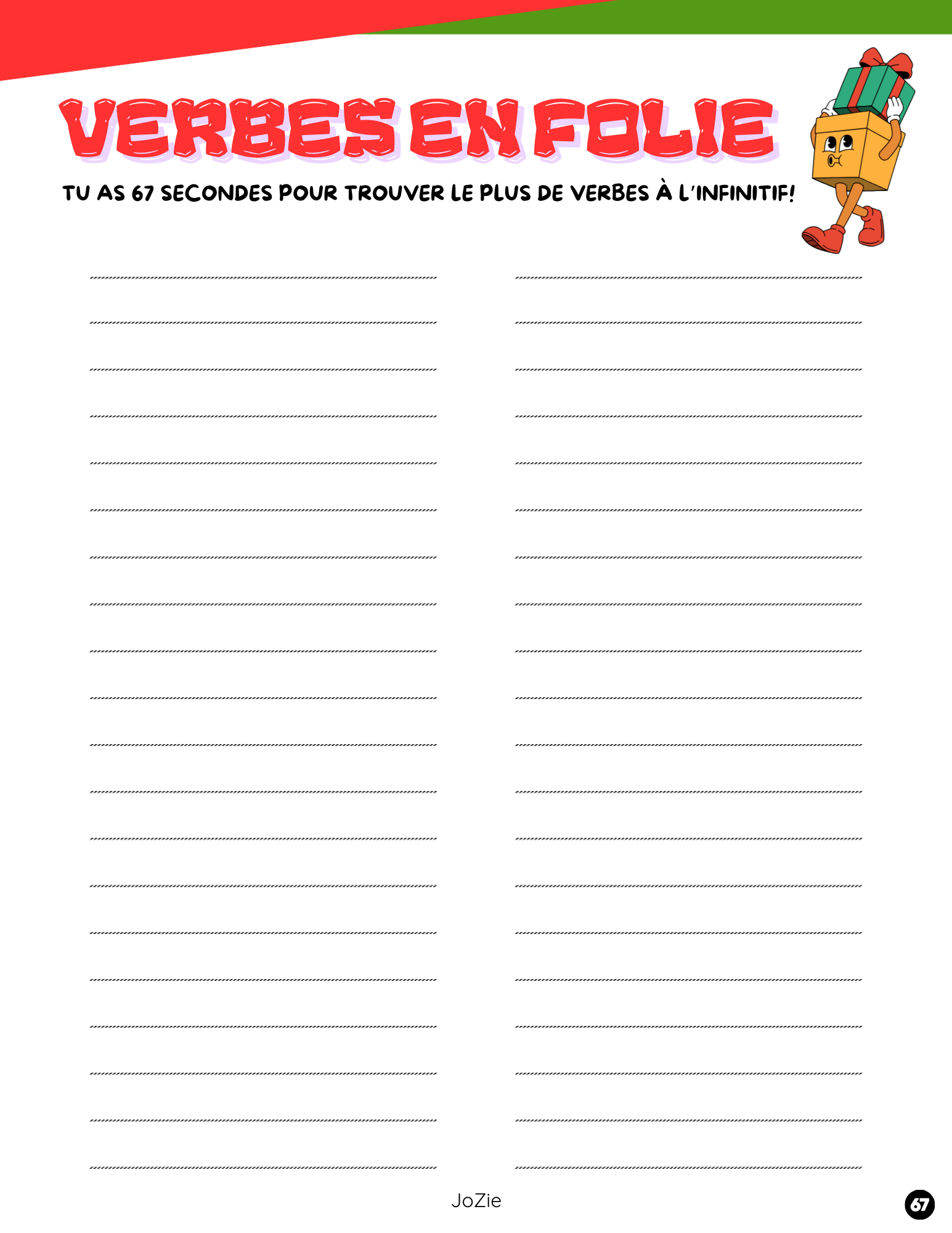 En français, ils auront 67 secondes pour trouver le plus grand nombre possible de verbes à l’infinitif. Ensuite, en équipe, ils tenteront de relever un défi coopératif : trouver 67 adjectifs différents le plus rapidement possible afin de devenir l’équipe gagnante!