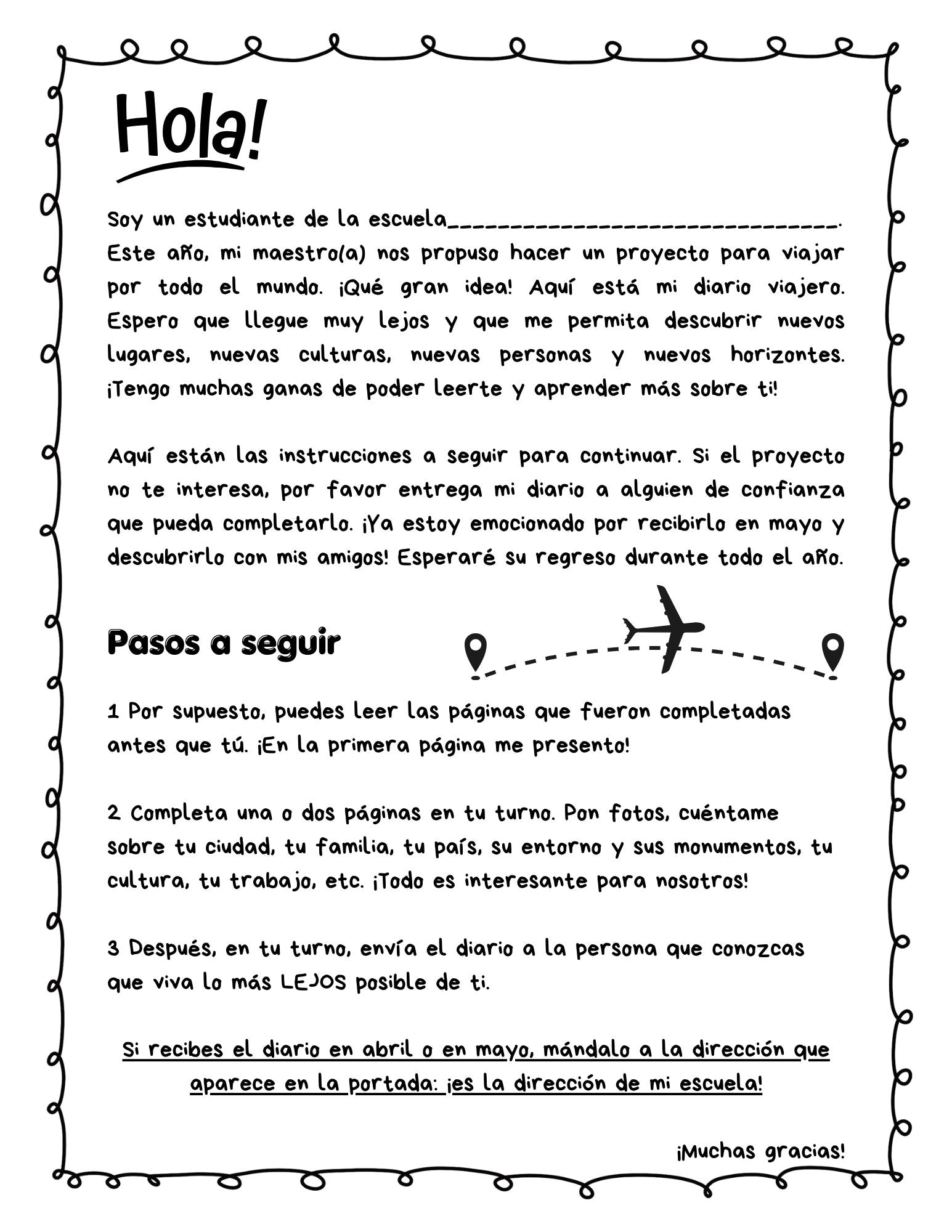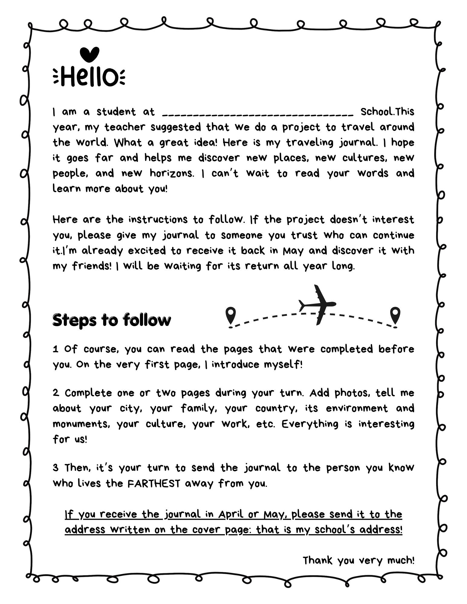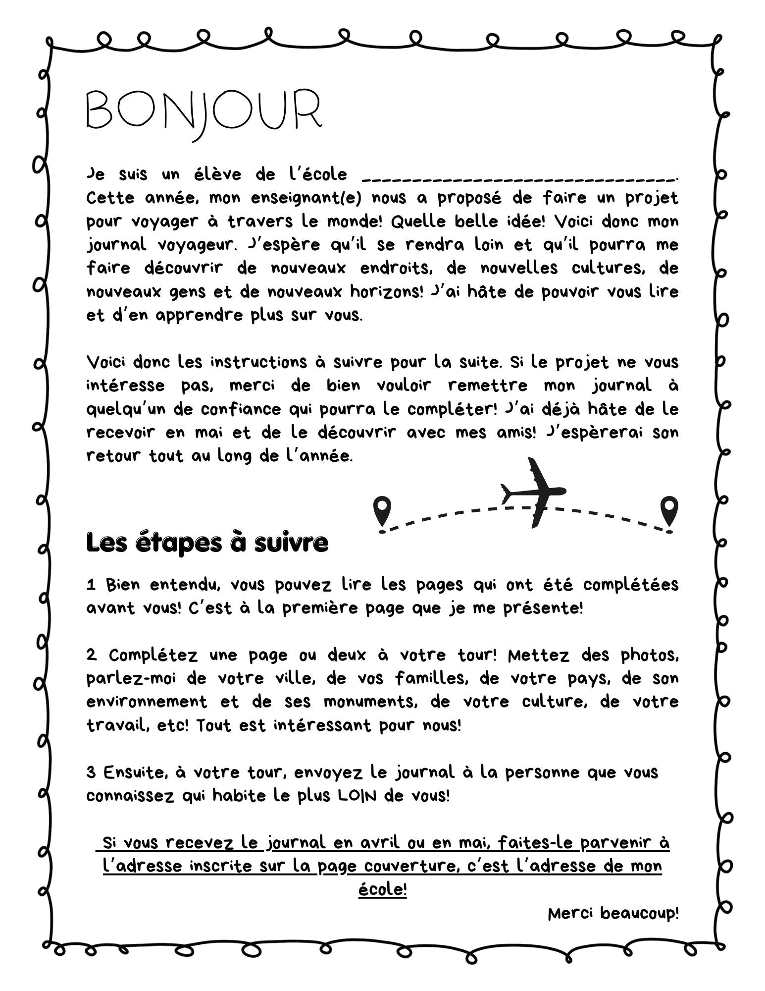 Simple à mettre en place, ce journal devient une véritable fenêtre sur d’autres cultures et ouvre la curiosité des enfants. Après avoir complété leur page de présentation (c'est ce que j'utilise comme première écriture), ils doivent simplement le remettre ou l'envoyer à une personne qu'ils connaissent qui habite le plus loin possible! Cette personne complète sa page et le fait voyager à son tour, ainsi de suite!