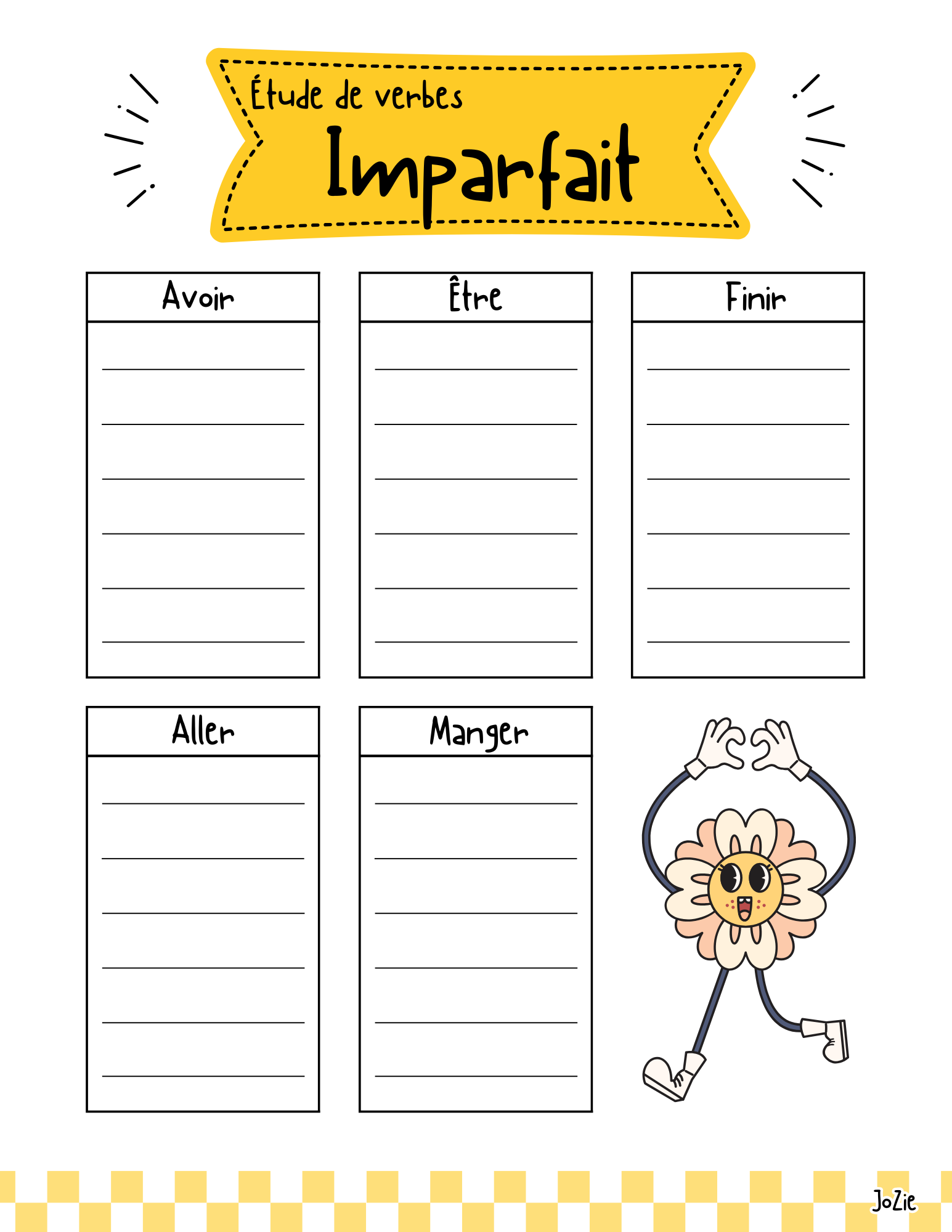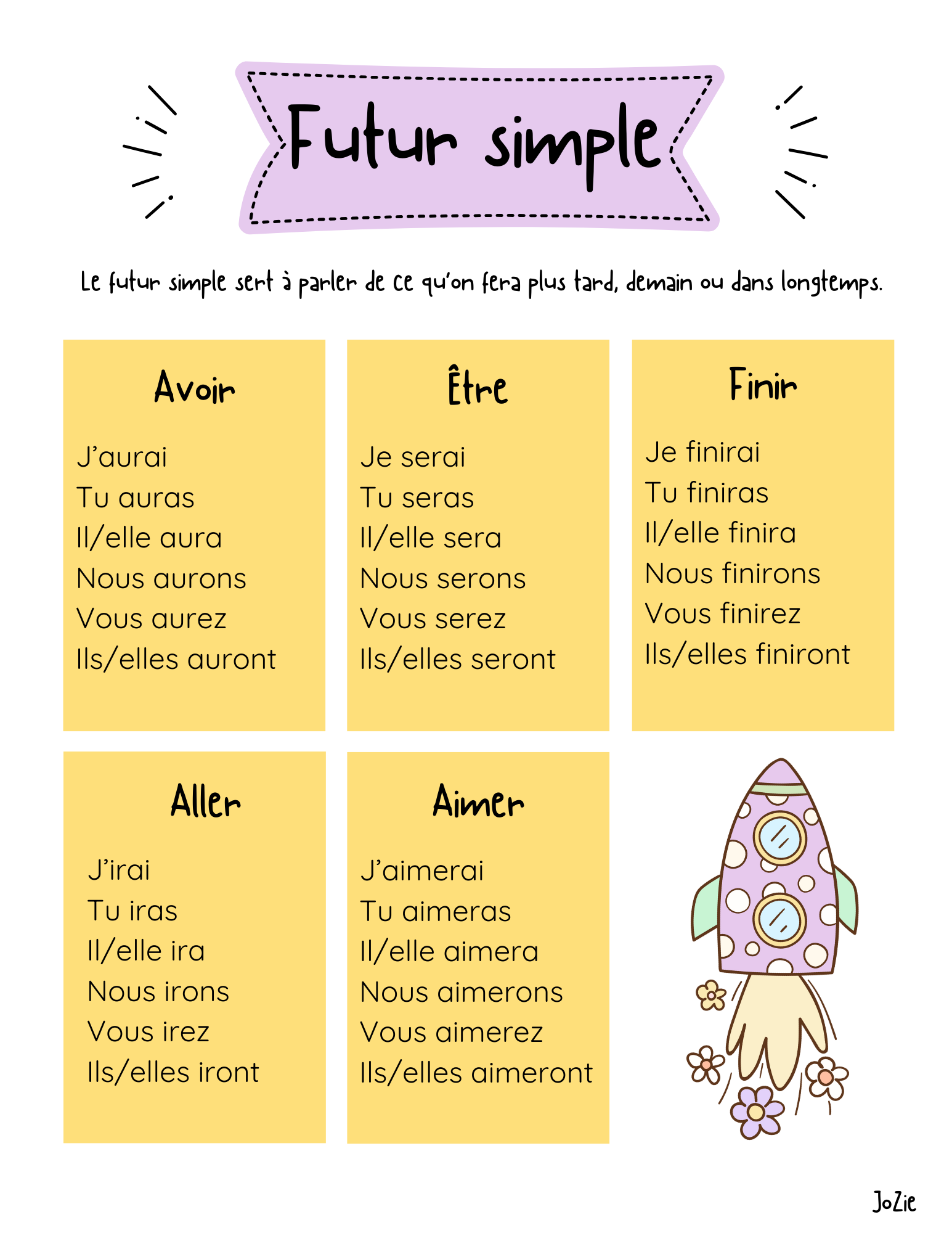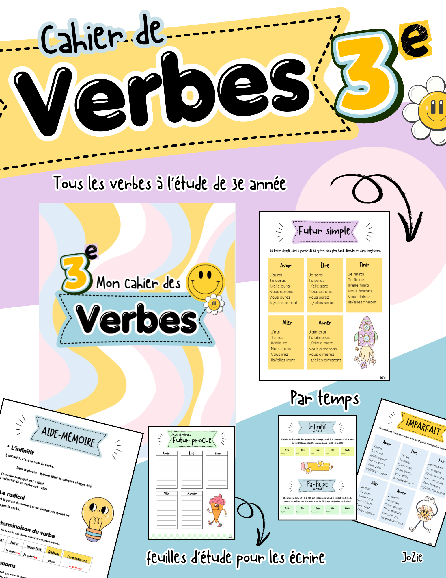 Voici un cahier de verbes présentant tous les verbes à l'étude en 3e année présentés par temps. (être, avoir, finir, aimer et aller) (présent, imparfait, futur simple, futur proche, conditionnel présent, infinitif, participe présent)