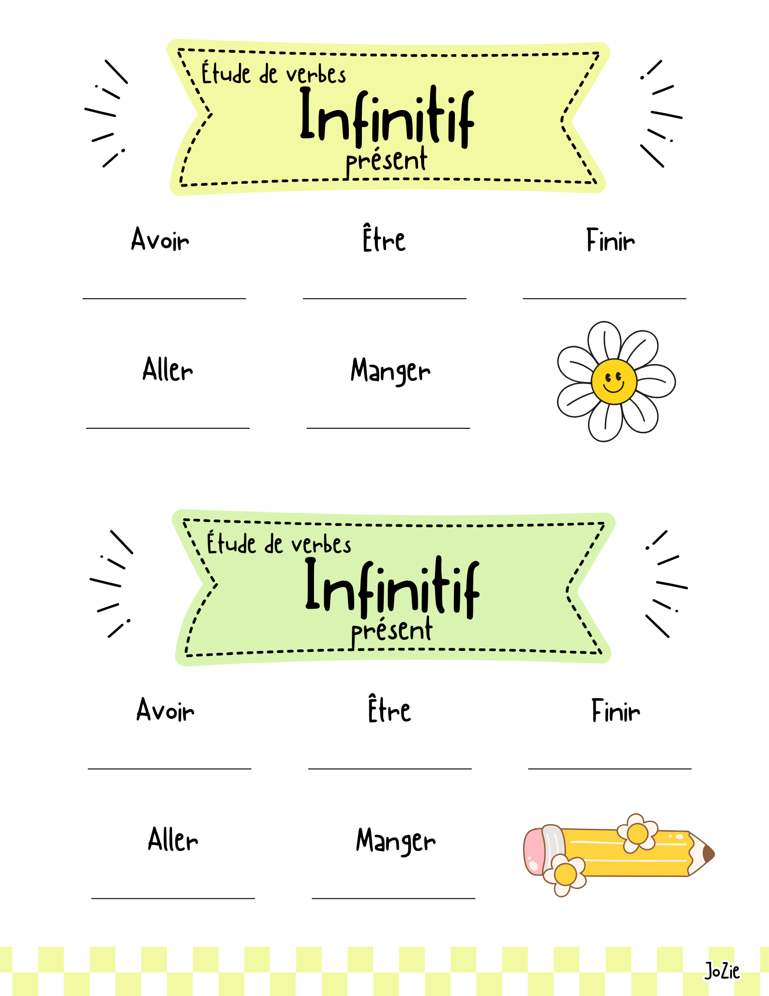 Le document comprend aussi un aide-mémoire: infinitif, radical et terminaisons, pronoms, etc. ainsi que des feuilles d'étude pour tous les verbes.