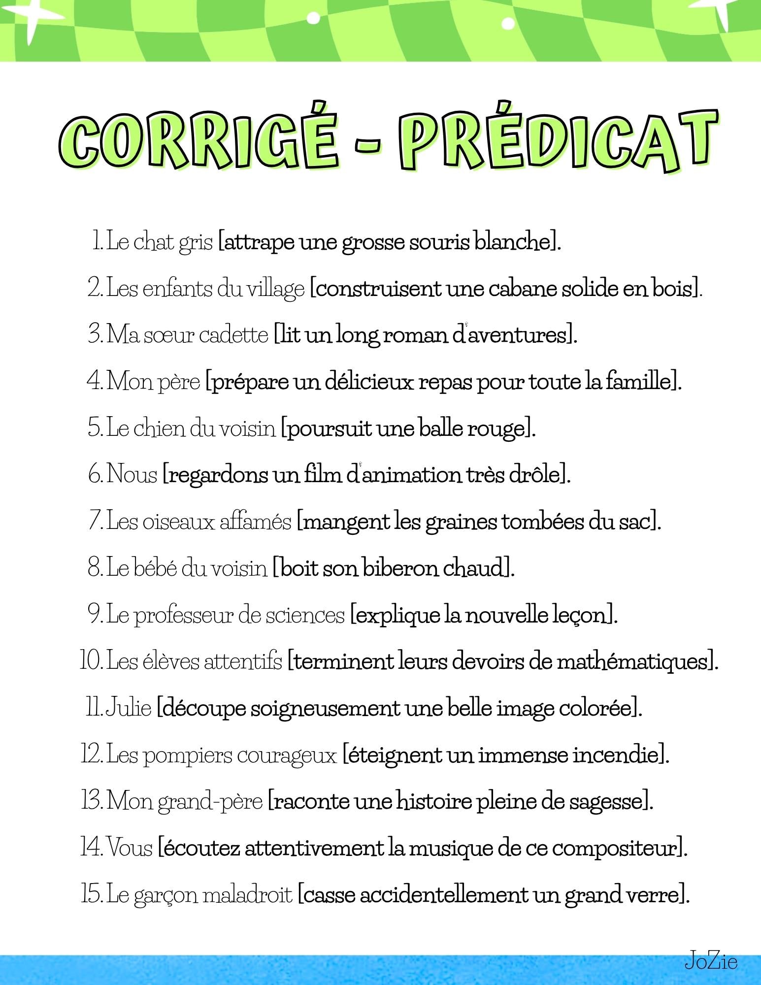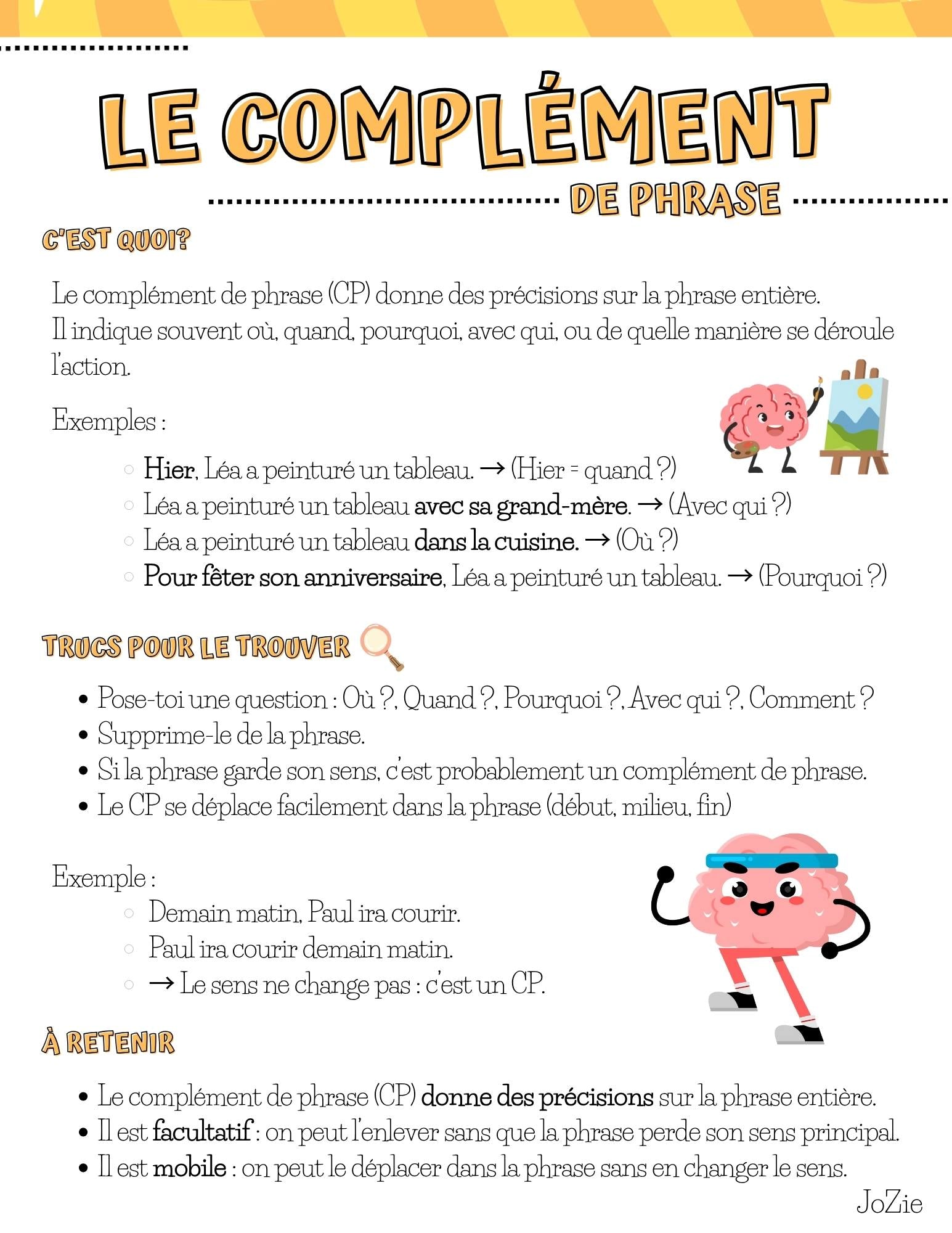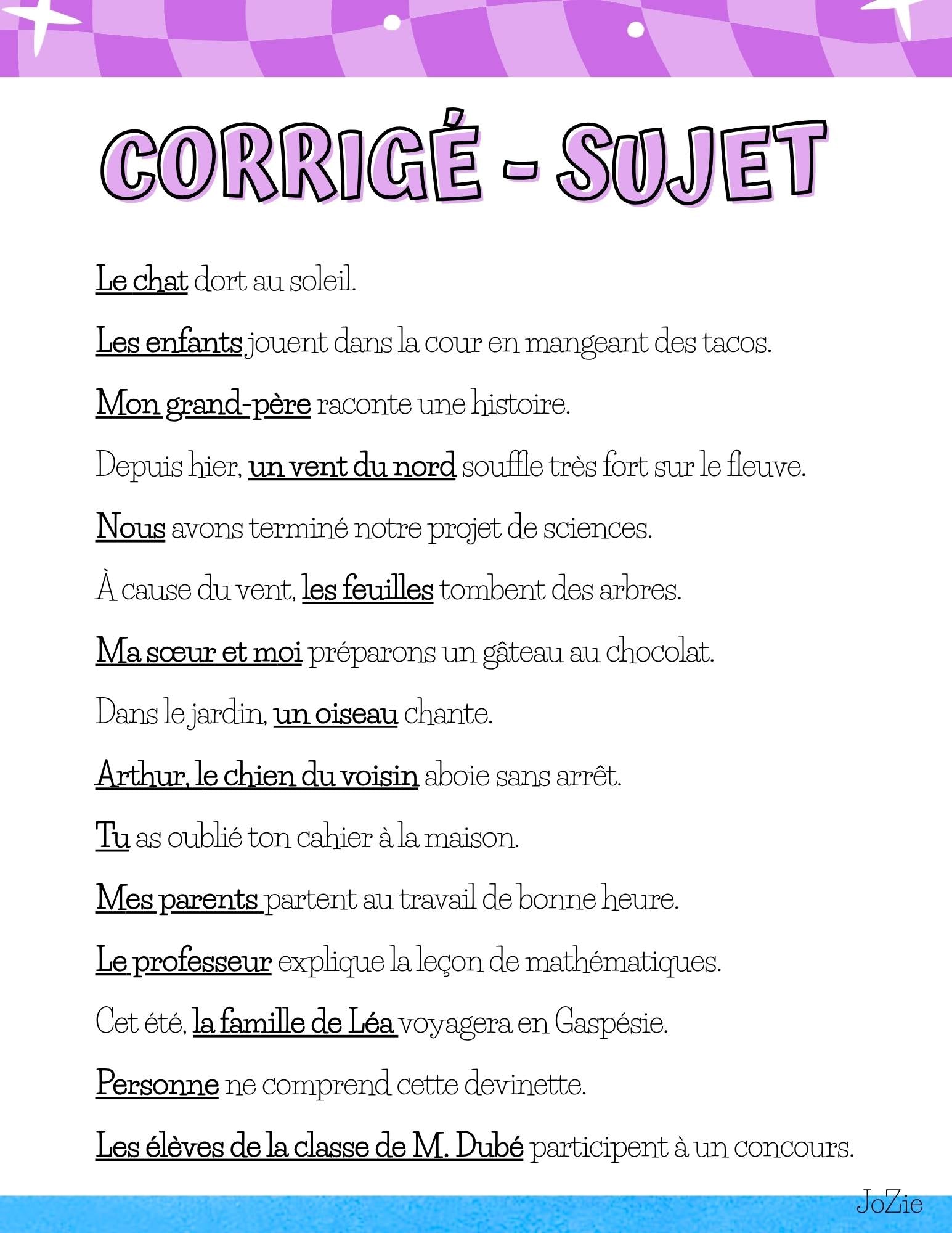 Les élèves apprendront à reconnaître le sujet, le prédicat et le complément de phrase grâce à des aide-mémoire simples, des exemples concrets et des exercices variés.