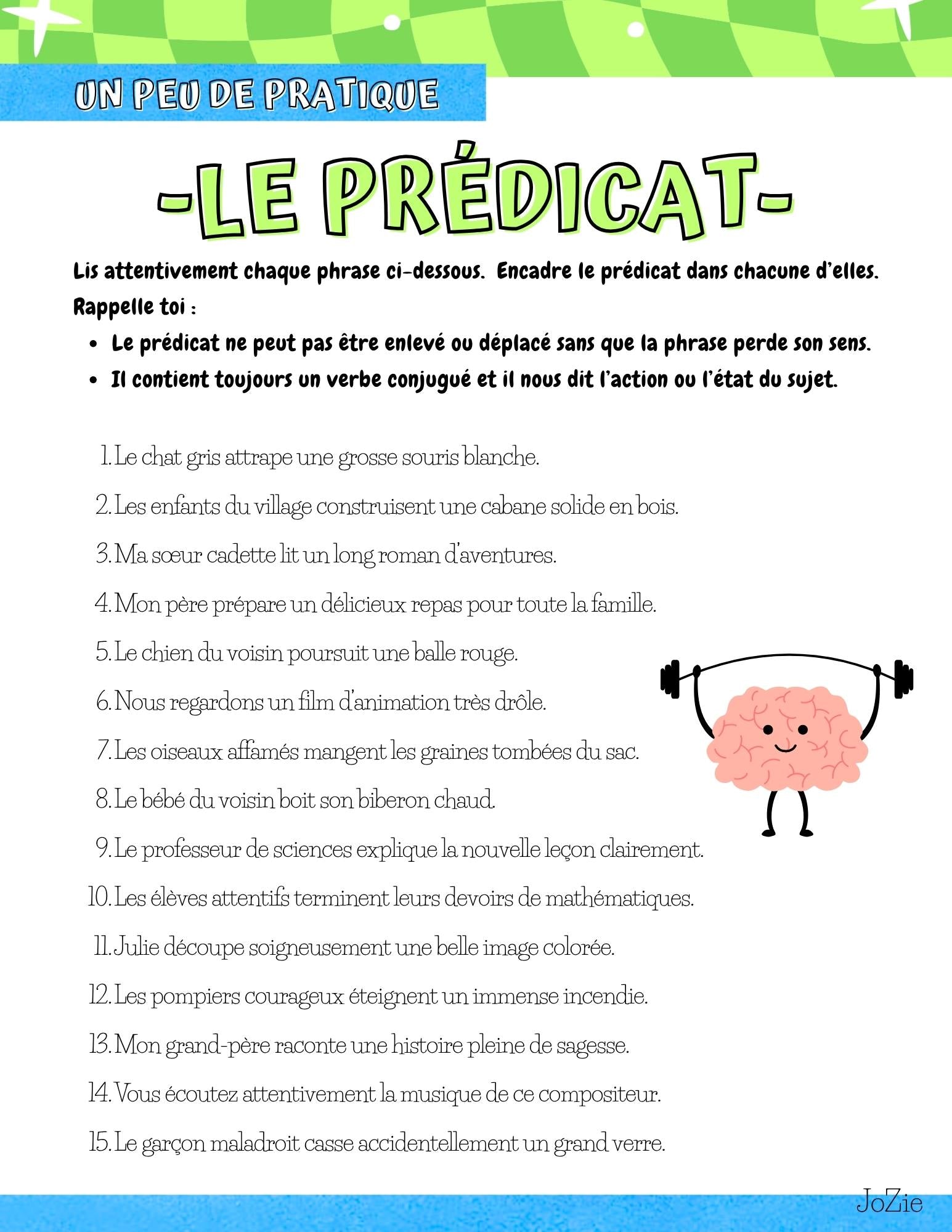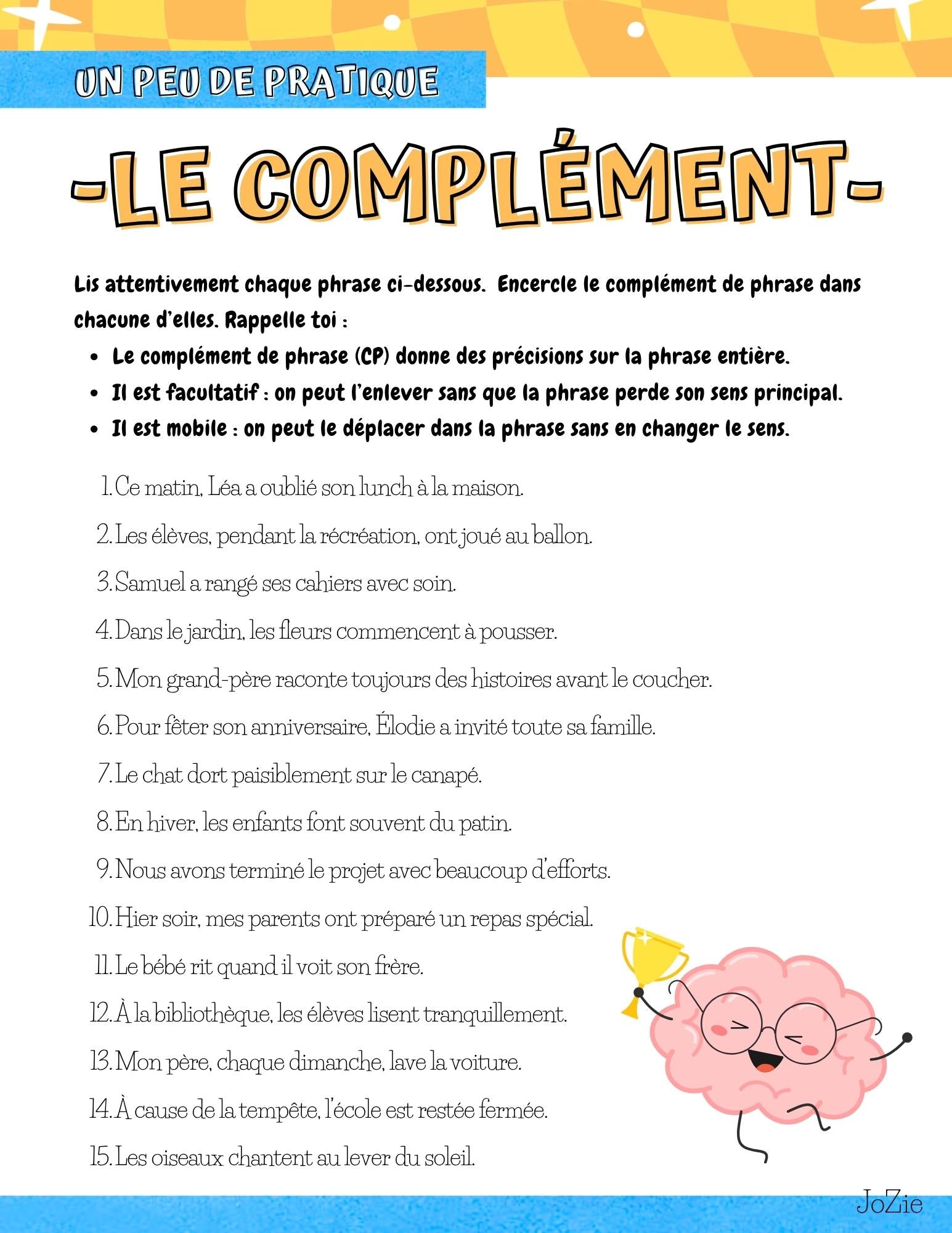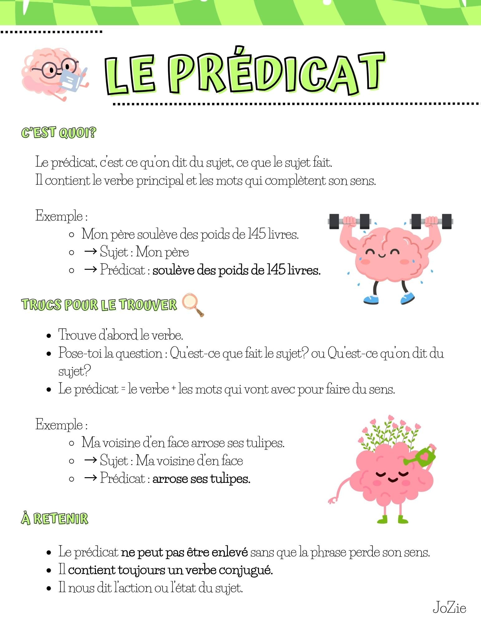 Les élèves apprendront à reconnaître le sujet, le prédicat et le complément de phrase grâce à des aide-mémoire simples, des exemples concrets et des exercices variés.