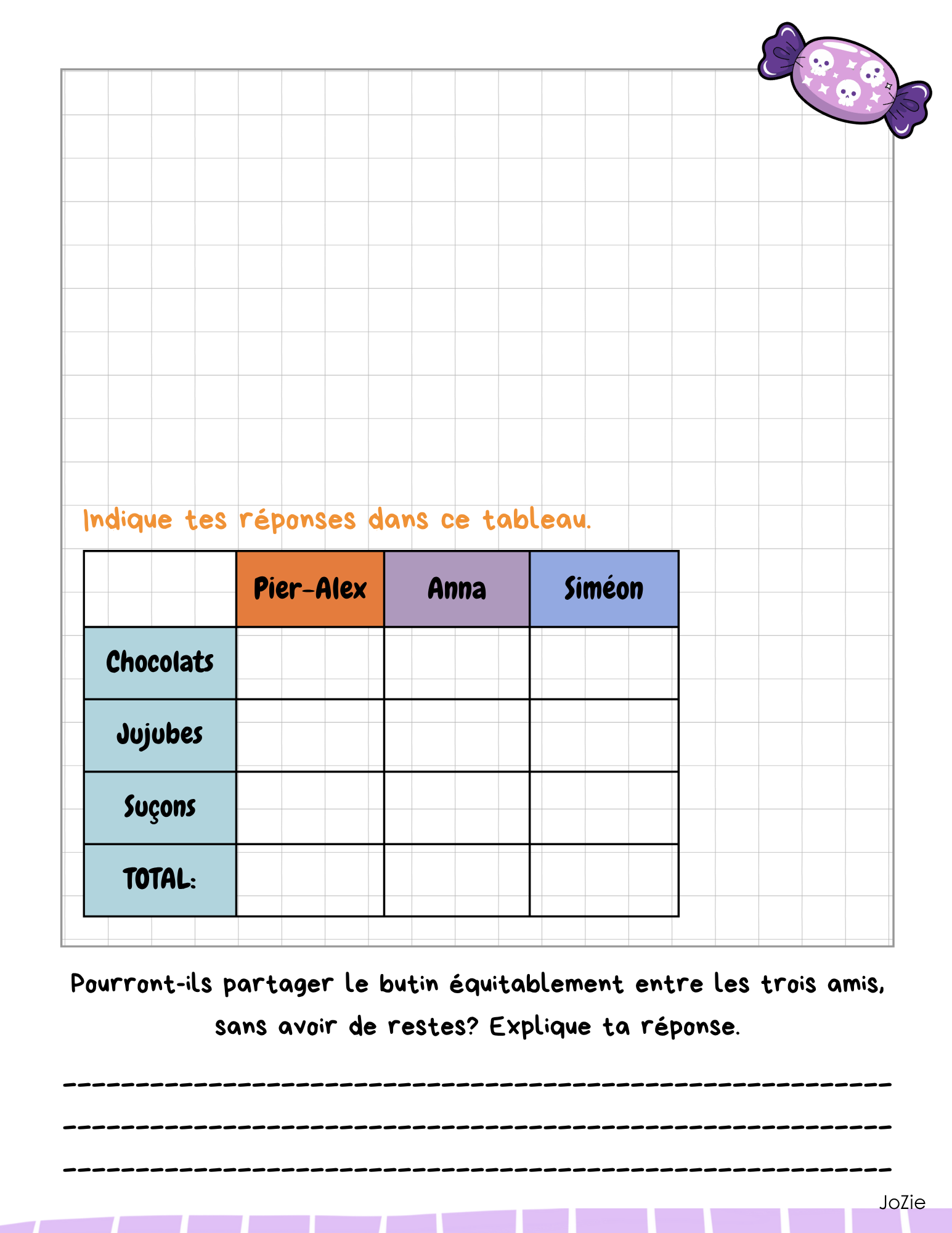 Mission Bonbons est une évaluation prête à utiliser qui permet de travailler plusieurs notions mathématiques du 3e cycle à partir d’une situation motivante sur le thème de l’Halloween!